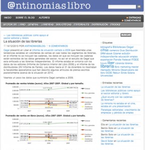 Os recomendamos visitar el blog Antinomias Libro donde hay artículos relativos al sector del libro, librerías, editoriales, edición digital, distribución, e-books. En este blog encontraréis información, comentarios, análisis y reflexiones bajo diferentes primas sobre aspectos relacionados con el sector del libro.